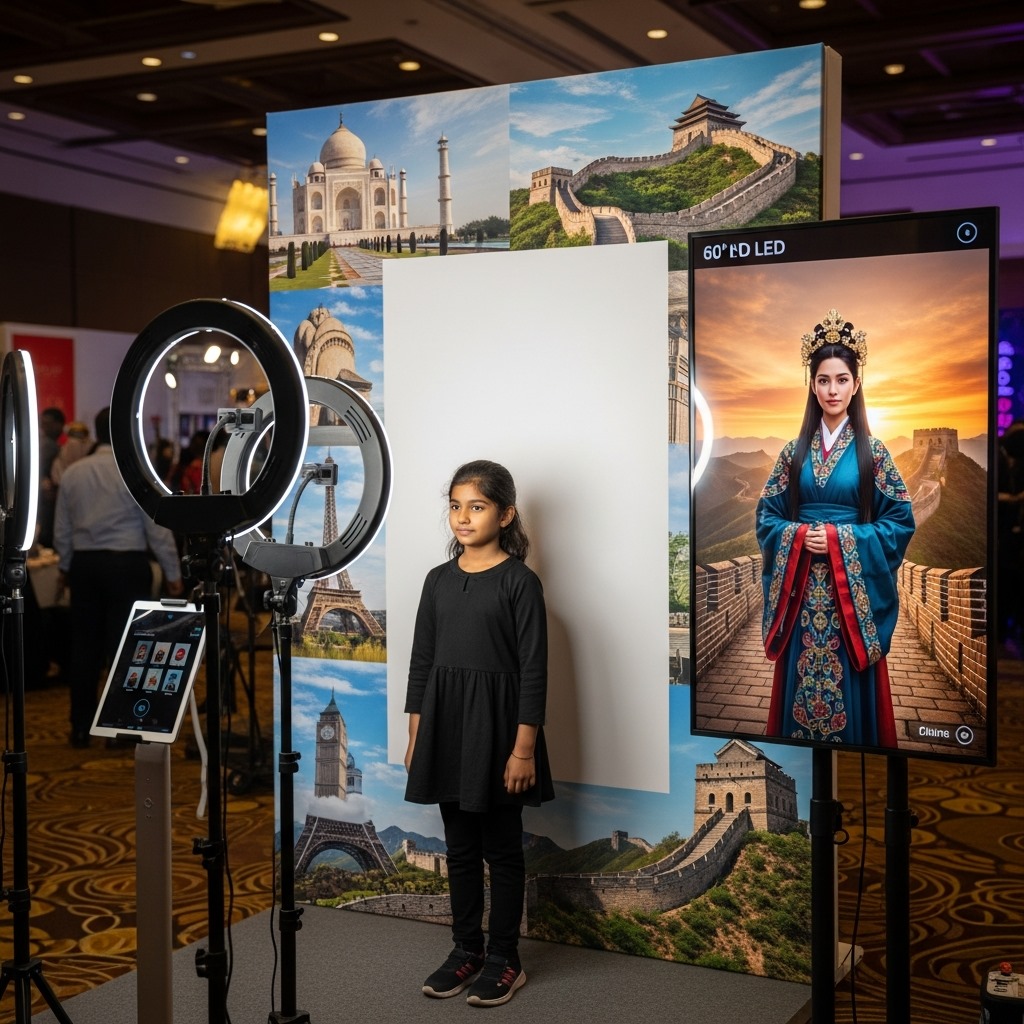 A unique photo activity that instantly transports guests into iconic locations across the world. From Time Square to the Great Wall of China, from Santa Claus Village to Las Vegas — guests can step into any era or destination and see themselves in a stunning themed portrait.